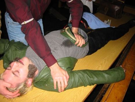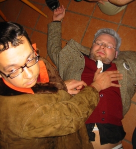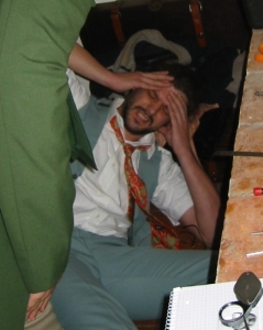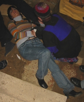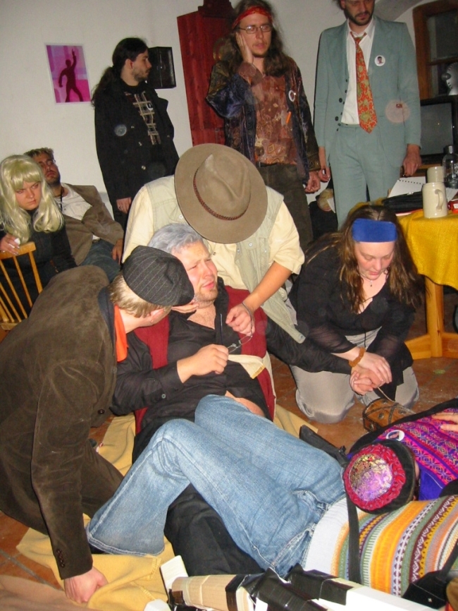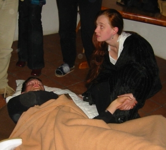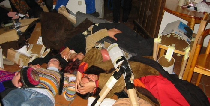Die Leichen werden von den Lebenden vor den Augen des Direktors aufgetürmt, in der Hoffnung er möge ein einsehen haben und so spricht er schleißlich unter Tränen die alles entscheidenden Worte. (Wer sich über die seltsamen Pappkameranden wundert der findet hier eine erklärende Bauanleitung)