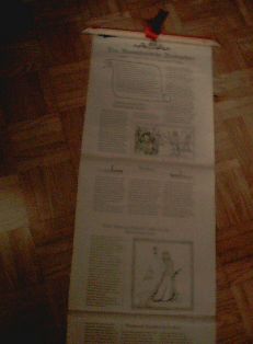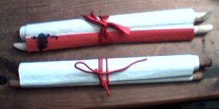 Beim Ankleben der oberen Stange muss vorher die rote Schleife angebracht werden: die Schleife in der Mitte falten und dann z.B. an die Stange antackern vor dem aufrollen; oder über die Stange legen (FOTO zur verdeutlichung, in etwa:) und dann aufrollen.