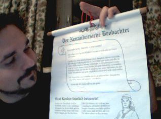 Wiederum gilt: man kanns auch auf „Pergament“-papier drucken lassen. Es sieht dann „perfekter“ aus und es geht ein wenig vom „mittelalterlichen Flair“ verloren. Die Druckerei des „Beobachters“ in Gormund bevorzugt die handgefärbte Variante.